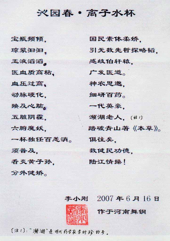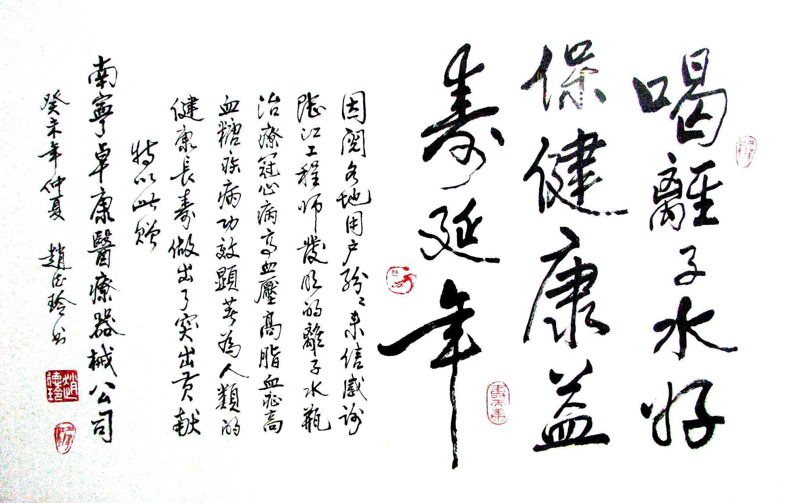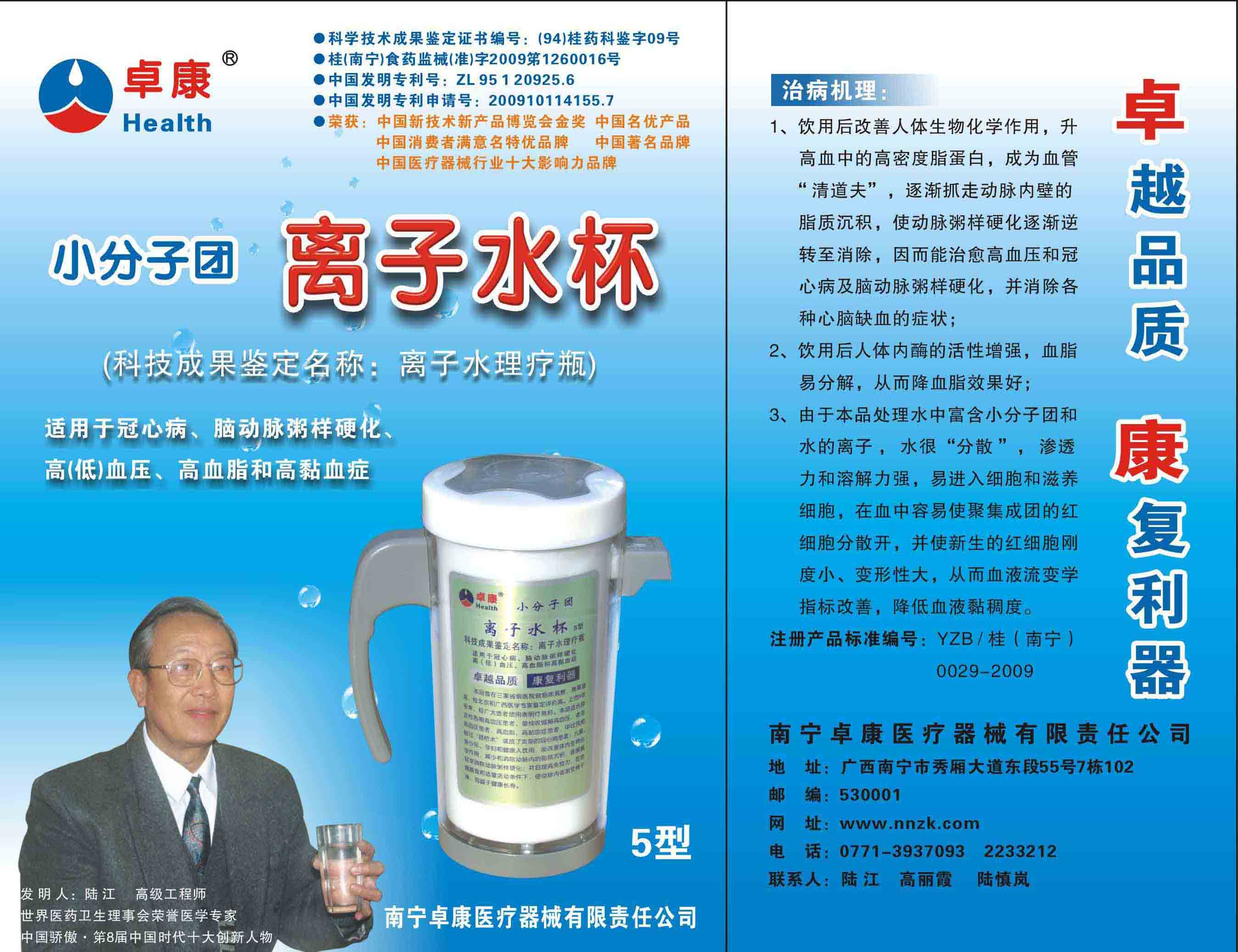 -----我是從事建筑的高工,本來沒有資格去攻克醫(yī)學(xué)難題,卻為了自身健康才扣響醫(yī)學(xué)的大門。由于我1990年患高血壓,因怕中風(fēng)才研究發(fā)明了離子水瓶,我把水處理成微小分子團(tuán)水,飲用后治愈了高血壓。便于1993年底送到三家省級醫(yī)院做臨床試用4個月。經(jīng)北京和廣西醫(yī)學(xué)專家鑒定:"降脂降壓效果好"," 能擴(kuò)大心腦動脈流量,改善心腦電圖以及微循環(huán)","對治療心腦動脈粥樣硬化、高血壓、高血脂有良好的醫(yī)療保健作用。""產(chǎn)品的技術(shù)性能和療效達(dá)到了同類產(chǎn)品的國內(nèi)領(lǐng)先水平,經(jīng)廣西醫(yī)學(xué)科學(xué)情報研究所檢索,未見國外有類似報道。"中國醫(yī)學(xué)科學(xué)院張正國教授從美國國立醫(yī)學(xué)圖書館數(shù)據(jù)庫存Medline檢索英俄文資料,均未見類似報告。2000年上市后,我為了對消費者負(fù)責(zé)而繼續(xù)觀察研究,一直通過《信譽卡》和《質(zhì)量跟蹤調(diào)查書》向患者承諾療效,請用戶使用6個月后反饋效果。和脂壓患者飲用2至5個月內(nèi),消除癥狀,停服藥物,血壓正常;冠心病患者飲用3~5個月逐漸減輕至消除心絞痛、房顫等癥狀,不再服藥,飲用1年左右心電圖正常,經(jīng)冠脈造影掃描無明顯狹窄,表明冠心病痊愈。大量患者還反映許多衰弱器官被修復(fù),讓前列腺增生、慢性咽喉炎、慢性氣管炎、支氣管炎、慢性胃炎、腸炎和膽囊炎等不藥而愈;2型糖尿病患者是因為胰島衰弱致病,飲用該水半年至一年,逐漸減藥至停藥,血糖尿糖正常,真正治愈2型糖尿病。中風(fēng)后遺癥患者飲用六七個月,可逐漸減輕至消除肢體和語言障礙,表明飲用該水能讓壽命很長的神經(jīng)元細(xì)胞逐漸修復(fù),奇跡般地恢復(fù)肢體和語言功能。飲用后還使胸腺和脾臟兩個重要的免疫器官被修復(fù)和增強(qiáng),產(chǎn)生免疫細(xì)胞多,提高了免疫力,使人不生病或少生病。自此, 飲用微小分子團(tuán)水創(chuàng)造了攻克冠心病、高(低)血壓和糖尿病三大醫(yī)學(xué)難題的奇跡。人們對此感到不可思議,但實踐是檢驗真理的唯一標(biāo)準(zhǔn)。